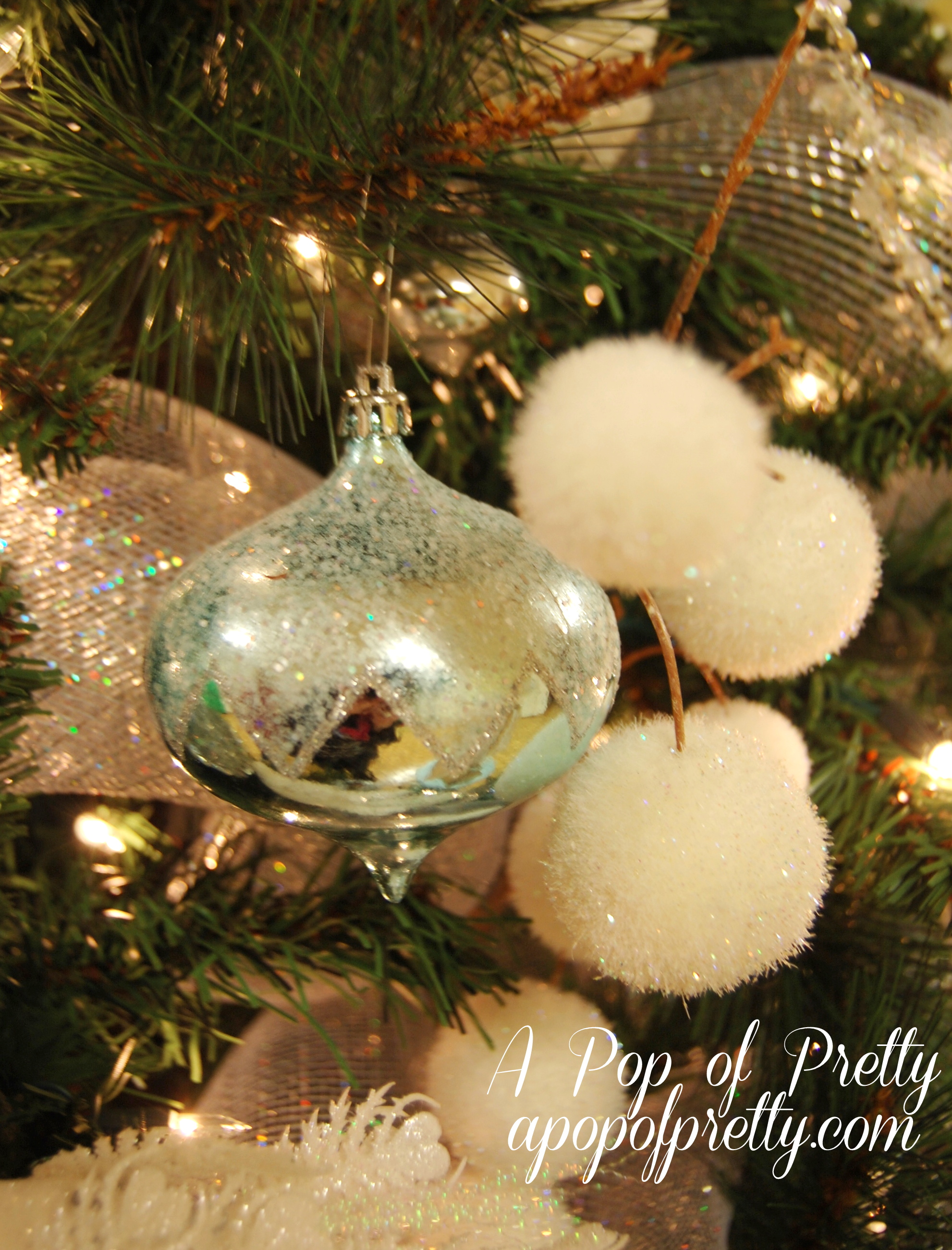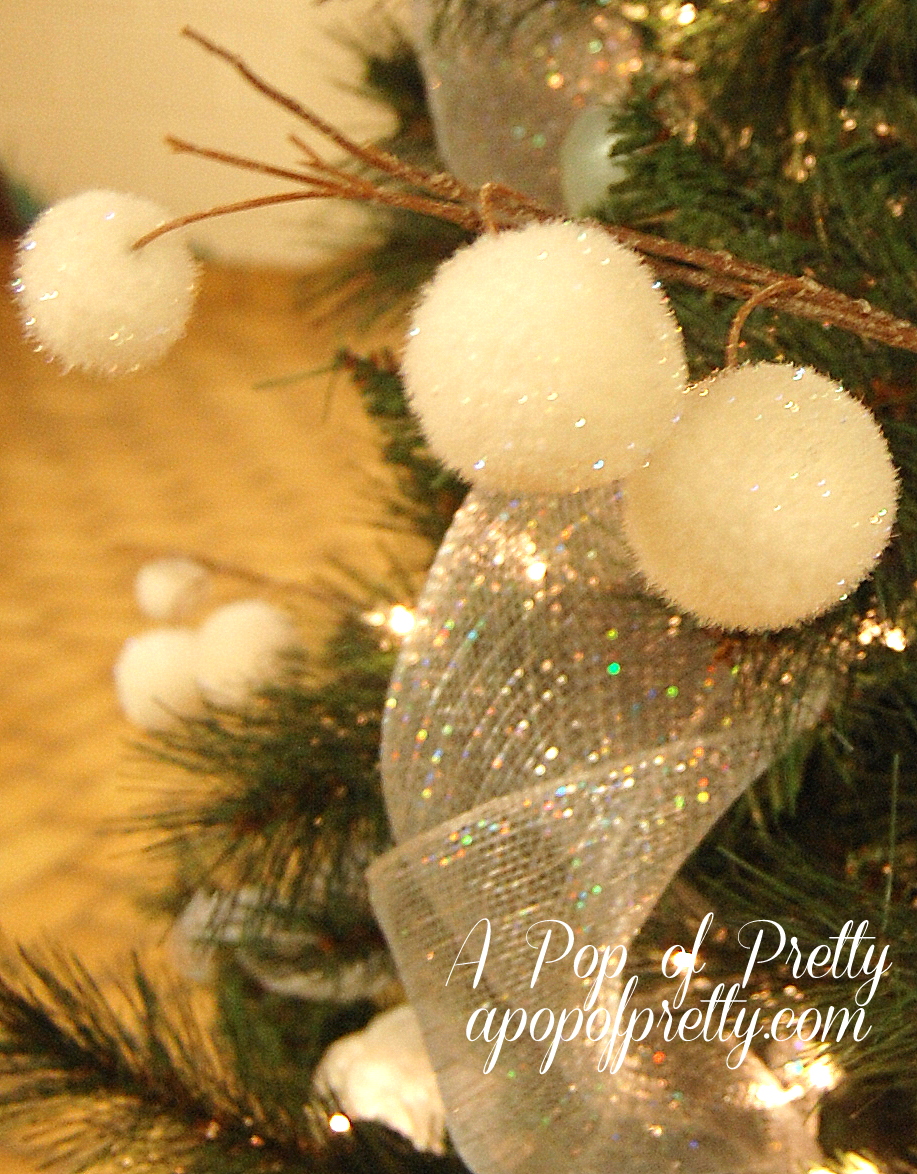 These snowball branches inspired the theme. When I spotted them, they gave me a vision for the tree, and helped in narrowing down the other ornaments to buy.