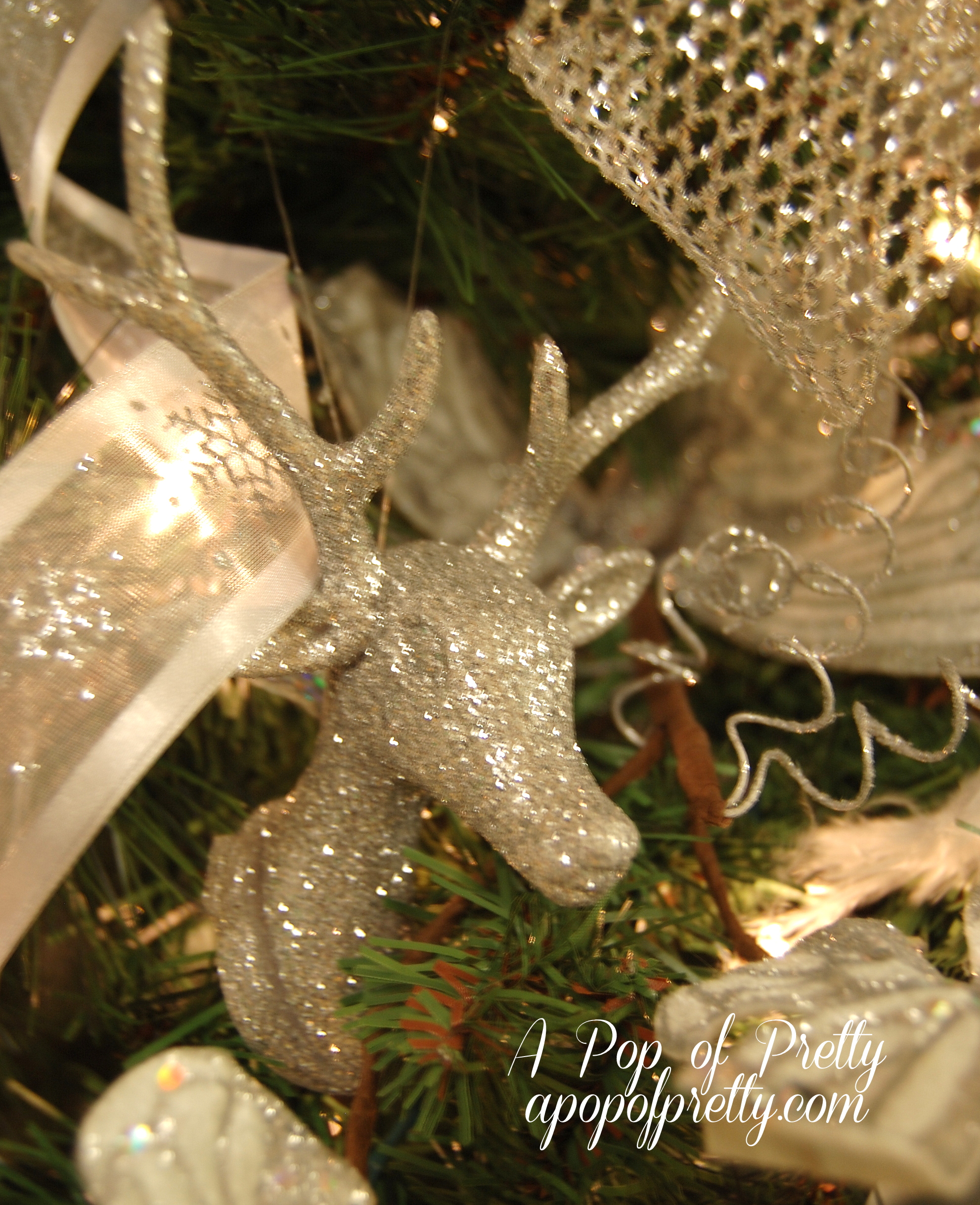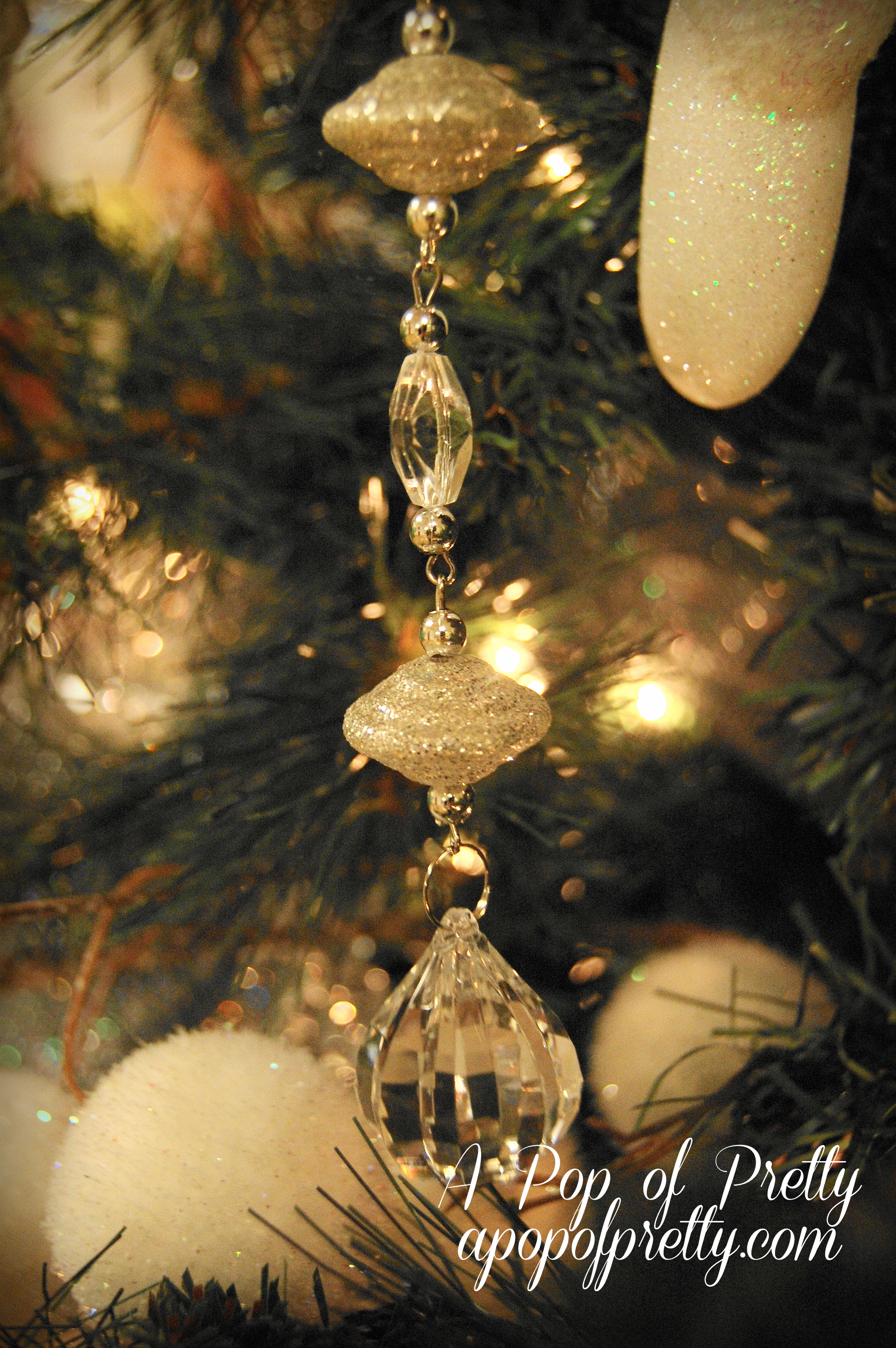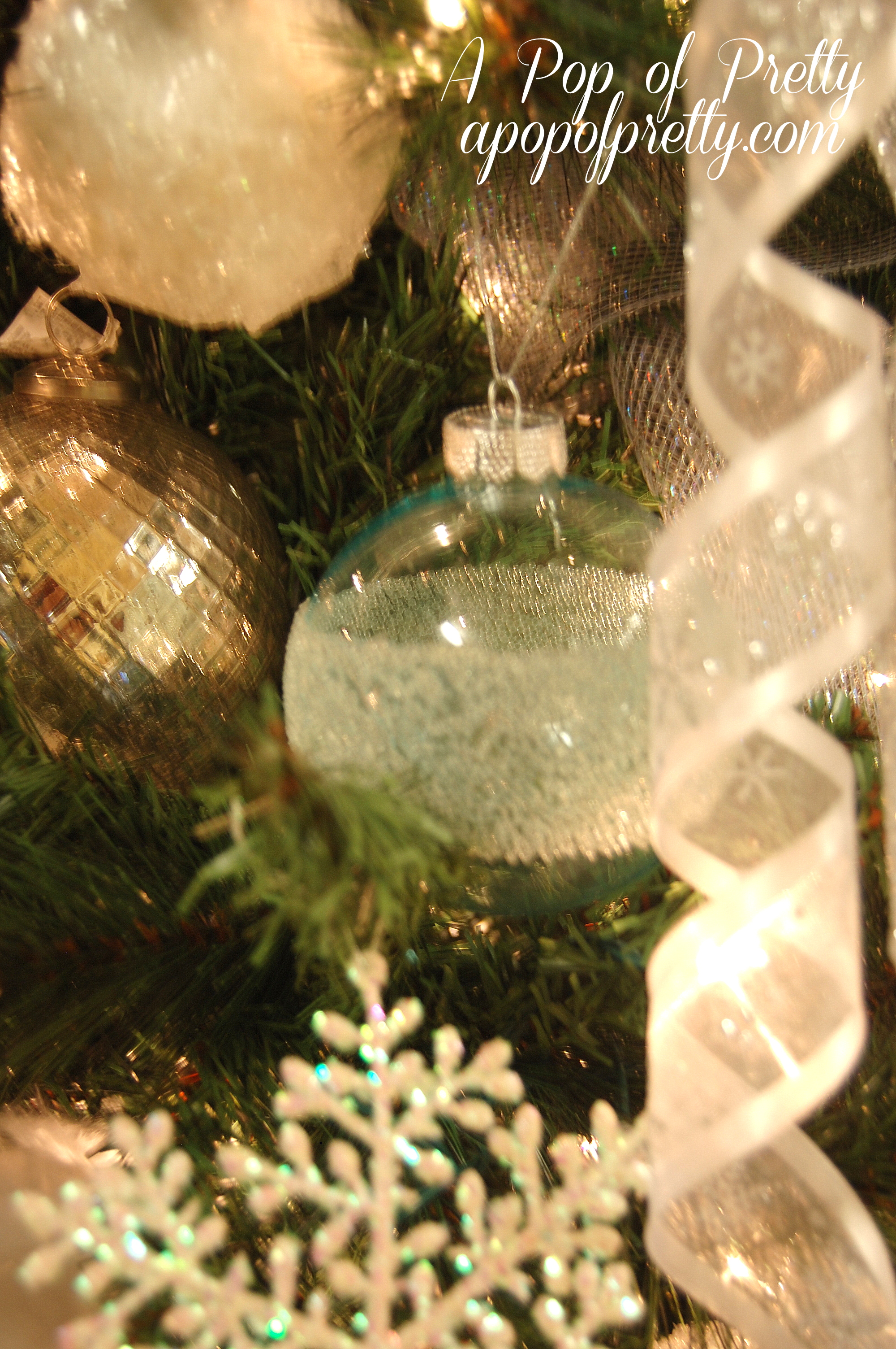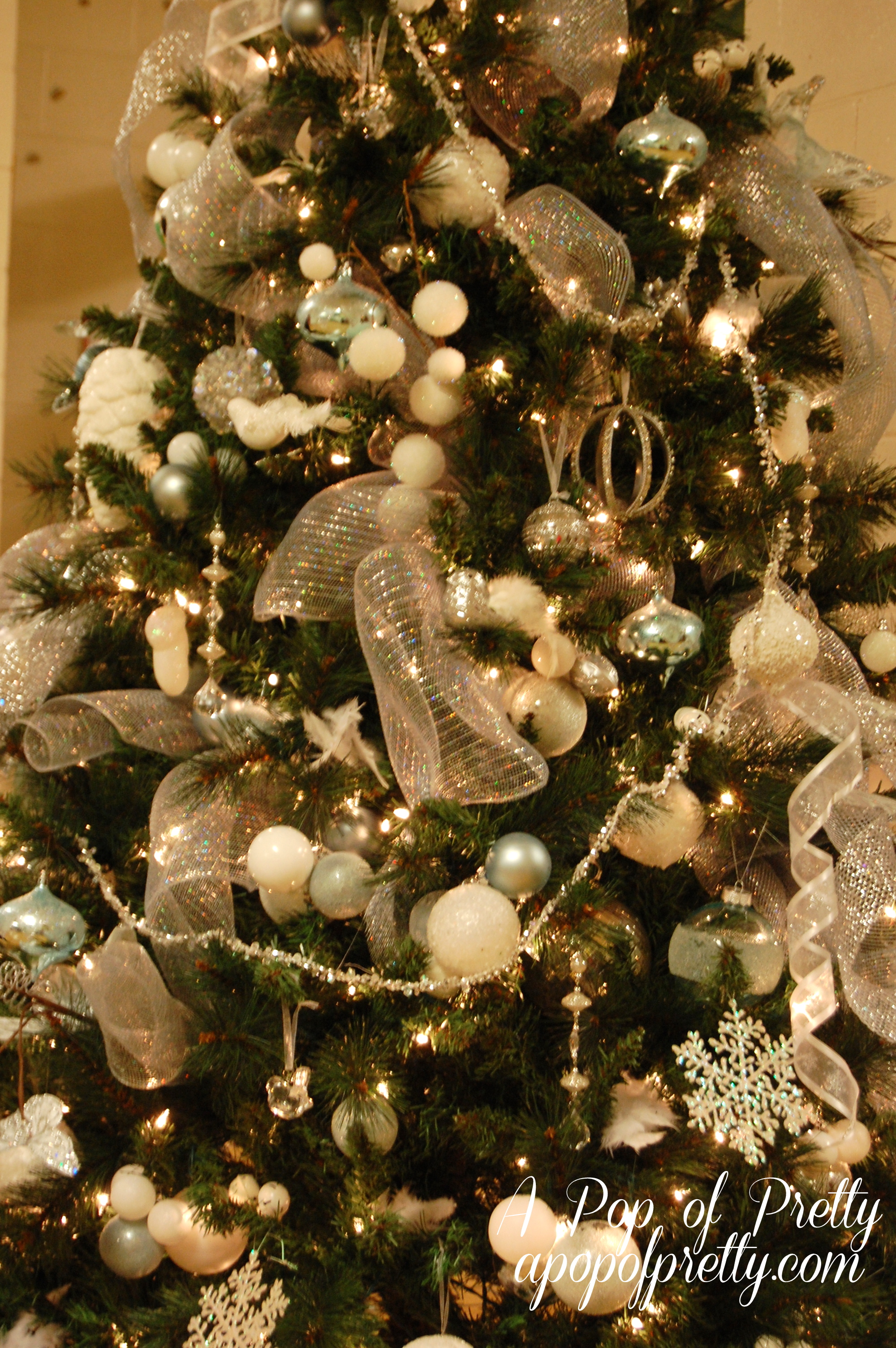 Once we knew we were going for a ‘Winter Wonderland’ effect, we chose to use all white. silver and blue ornaments – with a little bling here and there!