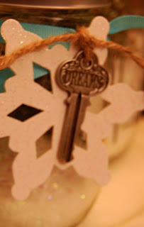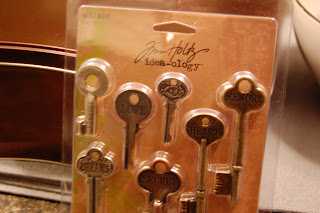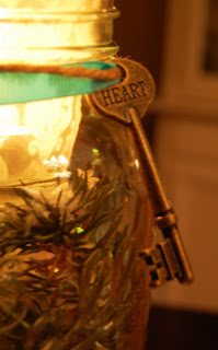 The votive holders that I used would not fit through the top of the jar, my original plan. However, they sat nicely in the opening, giving a kinda floating effect, so I went with it. (My general rule: Even if it doesn’t work out the way you plan: own it!). Finally, for the bling, I tied some grosgrain ribbon and twine around the top, and added these adorable junky little word keys that I found at Michael’s. These were a little pricier than I would have liked ($16), but I couldn’t resist. If you have any old keys on hand, they would do. (By the way, the entire collection by Jim Holtz Idea-ology is AMAZING).