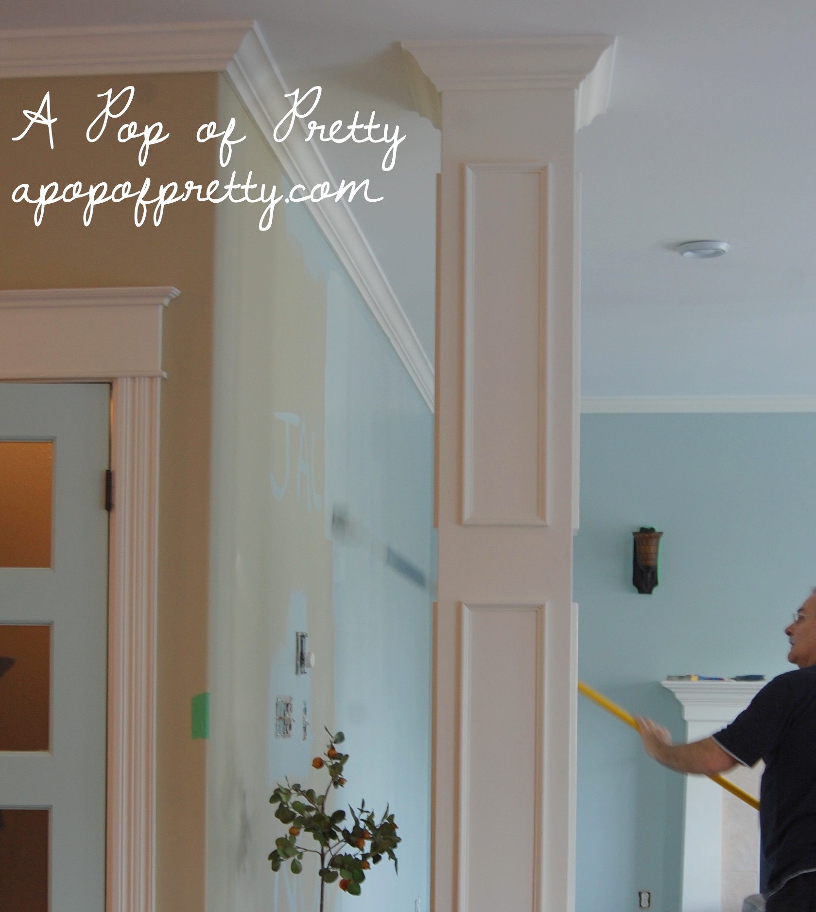 Now that we finished the blue, we’re on to the creamy white walls. (See there’s that ‘WE’ again!) For those, I chose Navajo White. Benjamin Moore describes Navajo White as “a timeless shade of creamy white with a generous dose of yellow, navajo white is a reliable choice to warm up cool-hued walls and indoor and outdoor trim”. Let’s hope!
